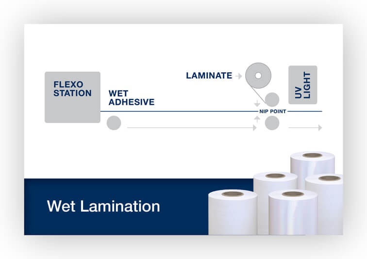 - Wet adhesive. Perhaps the biggest change when switching from self-wound laminates to wet lamination, wet adhesives are added to the final flexo deck on the press and metred out using an anilox roller and doctor blade. This step is completely in-line with the rest of production and enables facestock to receive a consistent coating of adhesive immediately after the ink is laid down. Unlike self-wound laminates, wet adhesives must be purchased separately from the laminate film. Nobelus has information readily available about adhesives that have been tested and approved for our films, but we expect many other types will prove compatible with field testing.